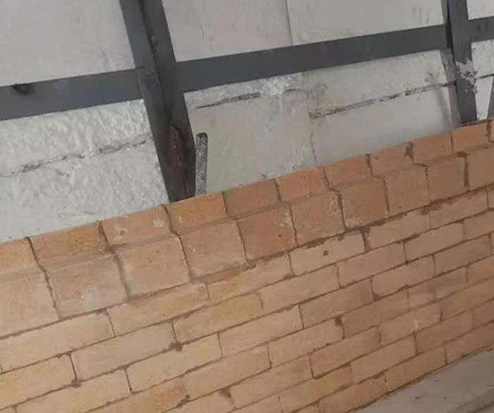 在入口煙道和出口方形煙道的側(cè)墻砌筑都屬直墻砌筑。砌筑前檢查爐殼尺寸偏差,在垂直方向上拉線,以保證墻體的垂直度。將水平線畫(huà)在金屬殼上,保證砌體的平整。砌筑方式與旋風(fēng)分離器相似。由于入口煙道底部爐殼有坡度,所以砌筑時(shí)砌體的平整度應(yīng)該特別重視。掛鉤磚應(yīng)砌筑在設(shè)計(jì)位置,并放線保證每層掛鉤在一垂線上。掛鉤磚不能有松動(dòng)現(xiàn)象,掛鉤不能過(guò)長(zhǎng)或過(guò)短。