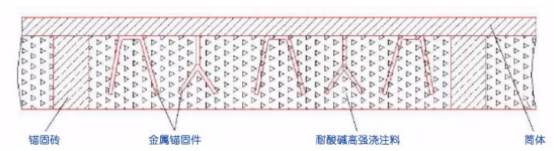 采用上述澆注料在回轉(zhuǎn)窯筒體的內(nèi)表面上澆注厚度不低于250mm。內(nèi)襯包括多塊呈軸向均勻分布固定于筒體內(nèi)表面的酸性或中性錨固磚,錨固磚兩側(cè)的筒體內(nèi)表面固定有多個(gè)均勻分布的金屬錨固件,再用耐酸堿高溫澆注料,該耐酸高強(qiáng)澆注料通過錨固磚和金屬錨固件與筒體連接為一體。局部內(nèi)襯結(jié)構(gòu)如圖1所示。